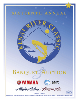 Complete live auction book and pages, and silent auction book cover designed by James K Brown III as a donation of time and resources from the Soldotna Chamber of Commerce/Kenai Peninsula Tourism Marketing Council to the Kenai River Sportfishing Association.